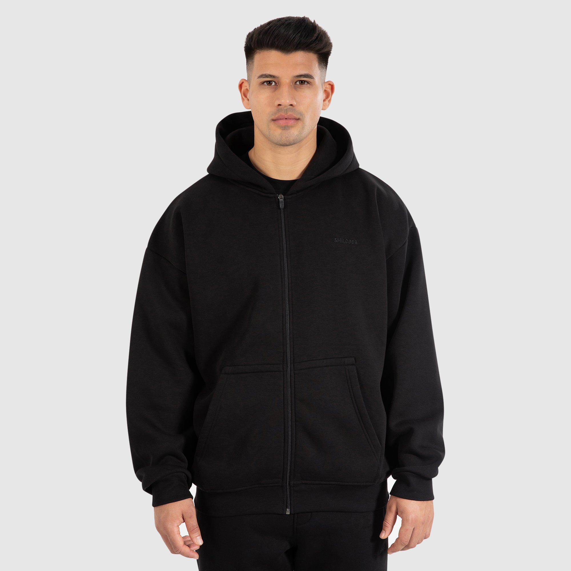 Der Smilodox Herren Zip Hoodie vereint sportlichen Stil mit maximalem Komfort. Der lässige, bequeme Schnitt und die große Kapuze machen ihn ideal für entspannte Tage und sportliche Aktivitäten. Der eingestickte Smilodox Logo-Schriftzug auf der Brust verleiht dem Hoodie eine hochwertige Optik, während der ton-in-ton farbige Reißverschluss den Look dezent und modern hält. Die aufgesetzte Kängurutasche bietet praktischen Stauraum und rundet das Design funktional ab – der perfekte Begleiter für Freizeit und Alltag.